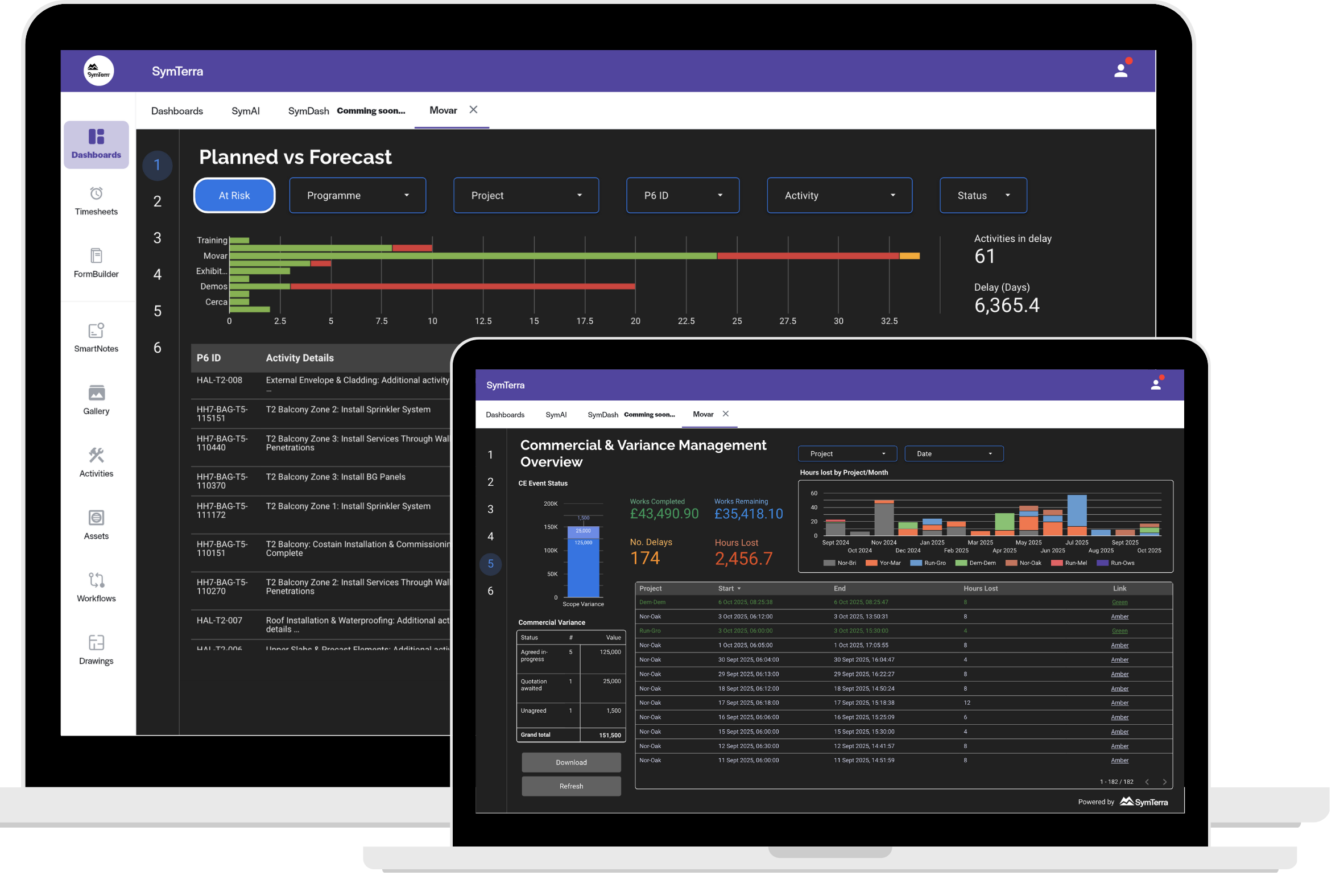 Know what’s happening, wherever you are, on whatever stage of the project you’re at. Easily connect your dashboard to on-site teams for real-time updates. SymTerra fully integrates with PowerBI and Looker: